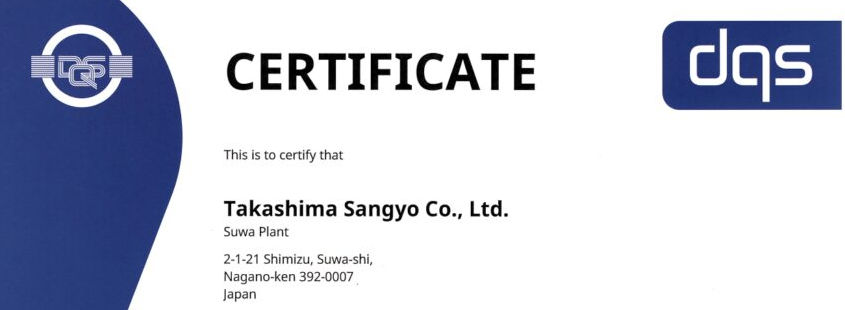 Takashima Sangyo has obtained the certification of IATF16949, an international standard for automotive management systems, which is regarded as a pass to enter the automobile component industry.