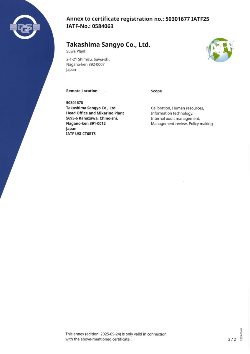 高島産業株式会社 諏訪工場は、品質マネジメントシステムISO9001に加え、自動車産業の国際的な品質マネジメントシステム規格であるIATF16949の認証を取得しました。